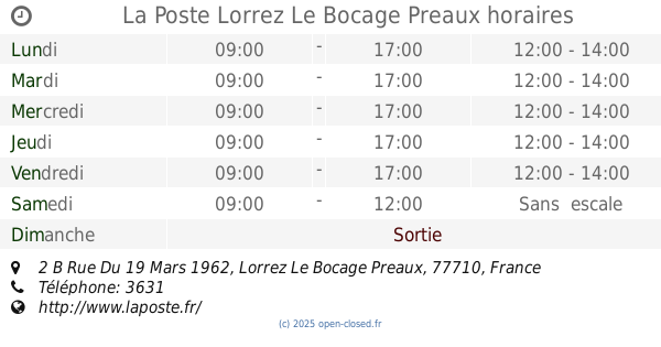 It is also possible to : Modifier ces HEURES D'OUVERTURE of Branche La Poste Dans Lorrez Le Bocage Preaux, 2 B Rue Du 19 Mars 1962,